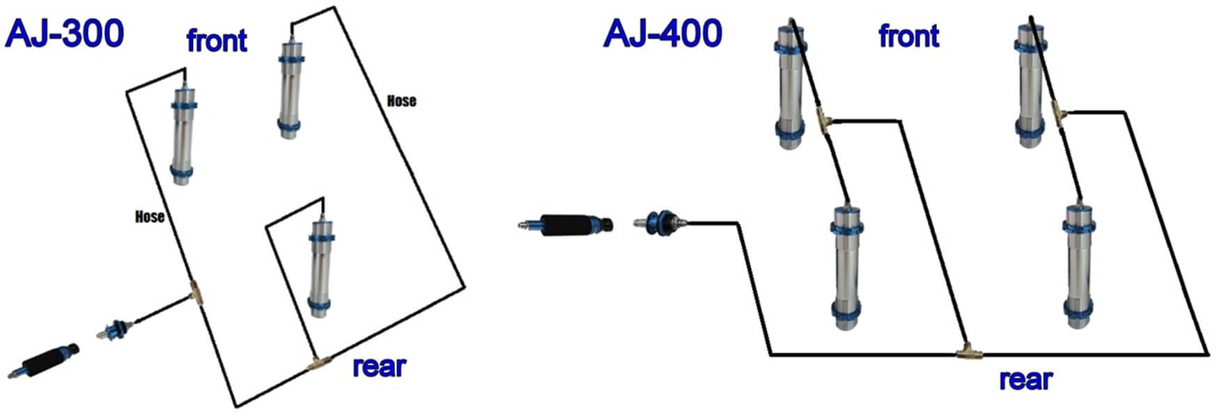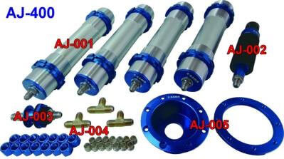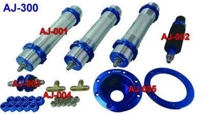 Our Race Car Pneumatic Jacks have a cylinder length of 321mm, a bore size of 53.7mm, a stroke of 234mm, and a weight of 1.38kg per cylinder. It has a powerful lift capacity of 500kgs and is designed to operate at a maximum pressure of 30 bar. Our Race Car Air Jack Systems Kits are available in AJ-300 and AJ-400 kits, with either three or four cylinders. They are anodized with a PP-04 flashing blue finish, but if you would like to change to a different anodized color, the minimum order quantity is 10 sets and we can help you change to any other anodize color from the color swatches. We also have safety props, please do not hesitate to contact us for further info about air jacks for race cars.